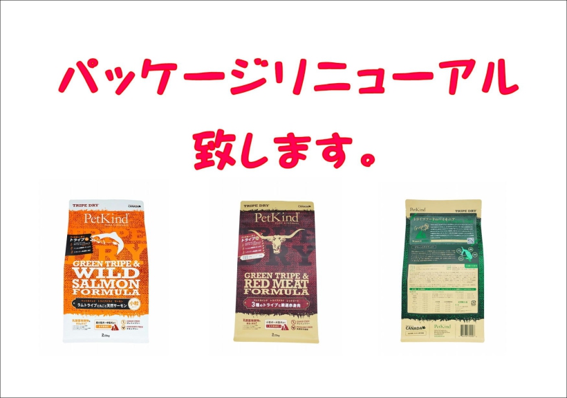 2022.03.16 お知らせ 特集 パッケージリニューアルお知らせ さて、この度PetKind「トライプドライシリーズ」に関し、下記の通り、パッケージリニューアルがございますのでお知らせいたします。 従来よりお客様の利便性が向上する改善となりますので、ご理解の程何卒よろしくお願い申し上げます。 今後も、製品のさらなる改善に努めてまいります。変わらぬご愛顧の程よろしくお願い申し上げます。 パッケージリニューアル一覧になります。