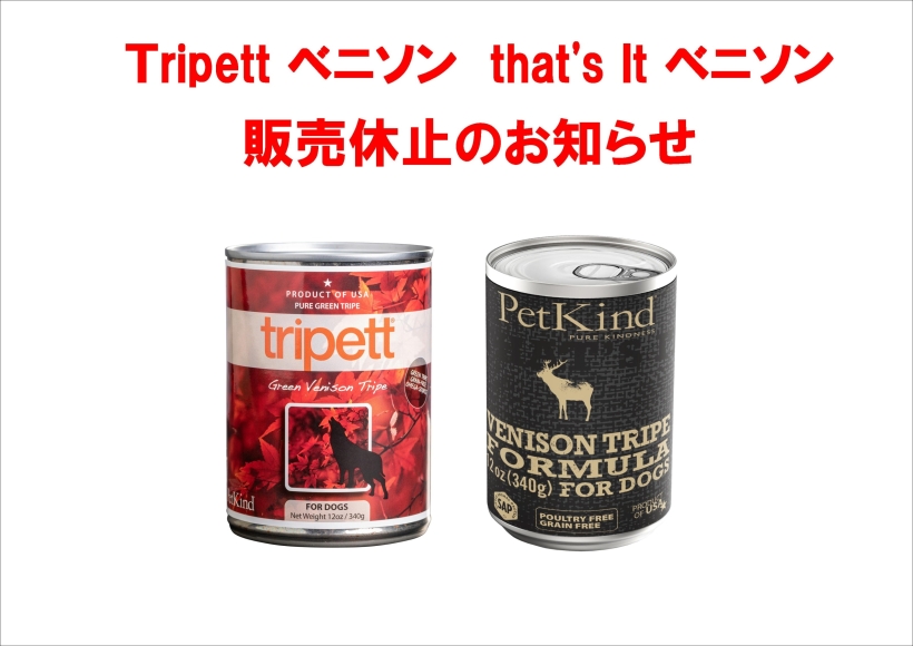 2024.11.21 お知らせ 特集 Tripett・that′s It ベニソン 販売休止のお知らせ 拝啓 貴社ますますご清栄のこととお慶び申し上げます。平素より弊社製品のご拡販に格別のご尽力を賜り厚くお礼申し上げます。 PetKind Wetベニソン缶340gが休売となります。 お取り扱い頂いております各お得意先様におかれましては突然の休売となり大変申し訳ございません。ご理解の程、何卒宜しくお願い申し上げます。
